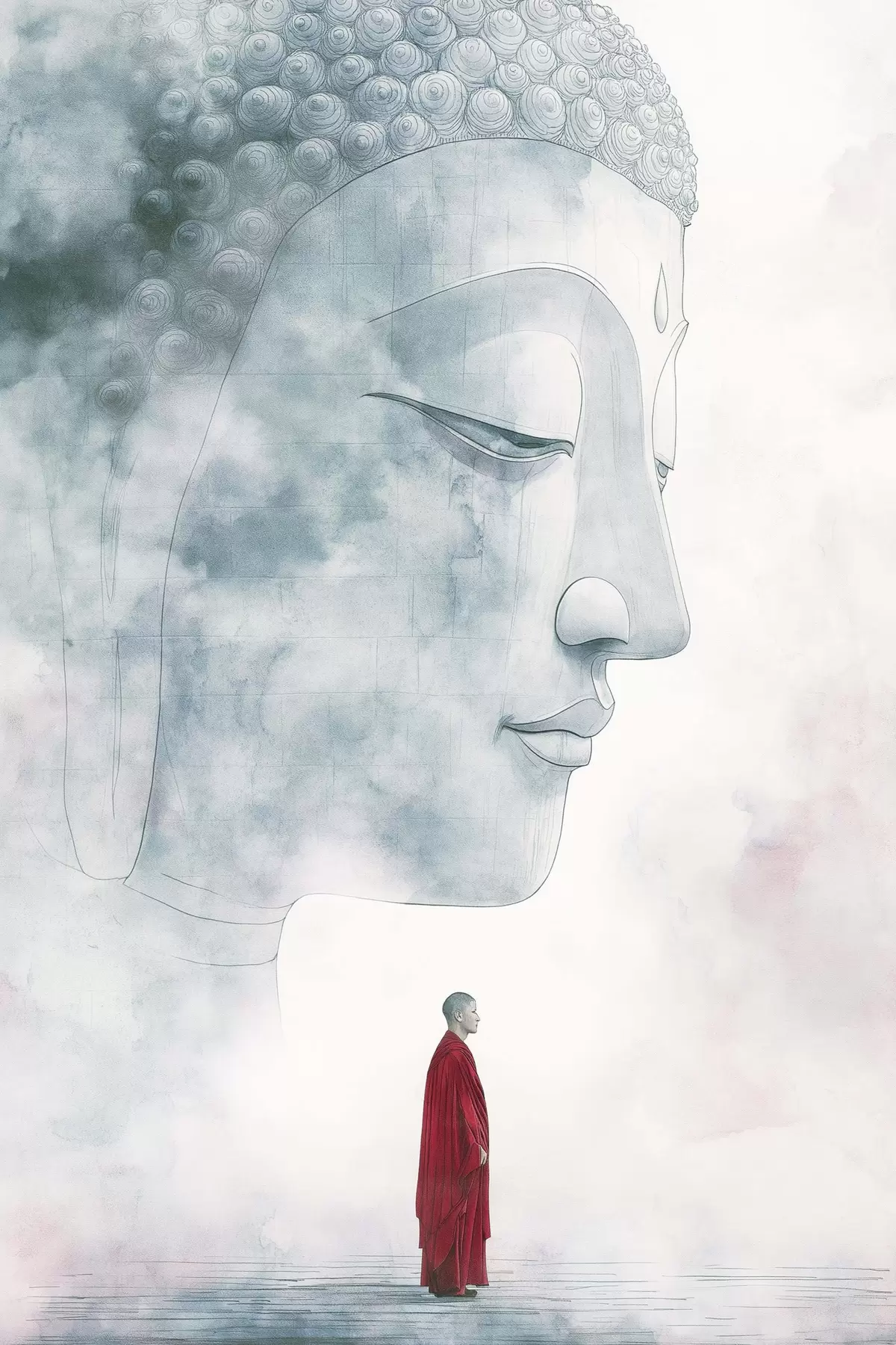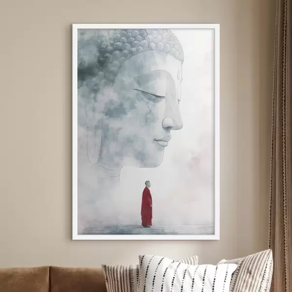 Poster Boeddhistische monnik in rood gewaad, Boeddha-silhouet, aquarelstijl Nr f44006