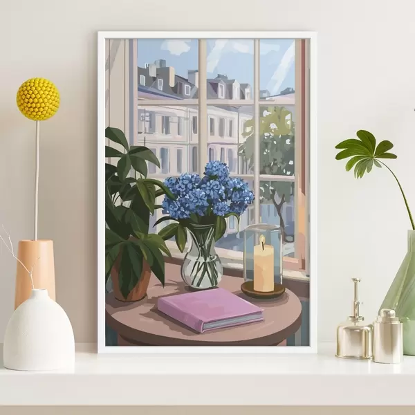 Poster Hortensia's in de vaas, raam, kaars, gezellig huis f44009