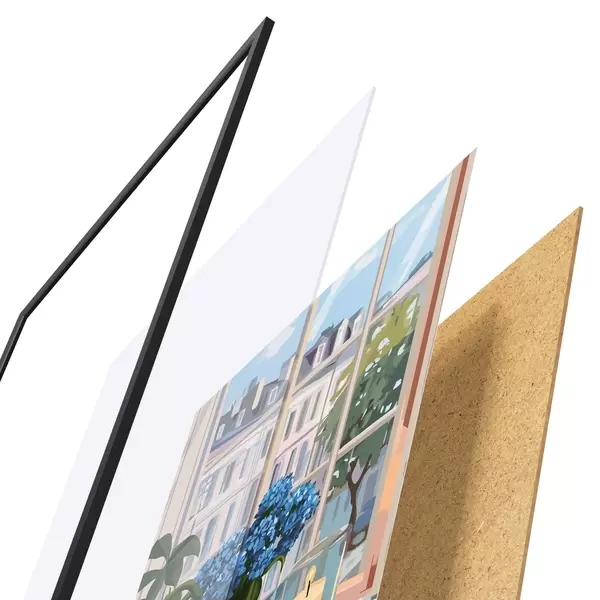 De poster bestaat uit een frame, plexiglas, geprinte afbeelding en spaanplaat achterkant. De poster kan meteen aan de muur worden gehangen dankzij de bevestigingen op de achterkant.