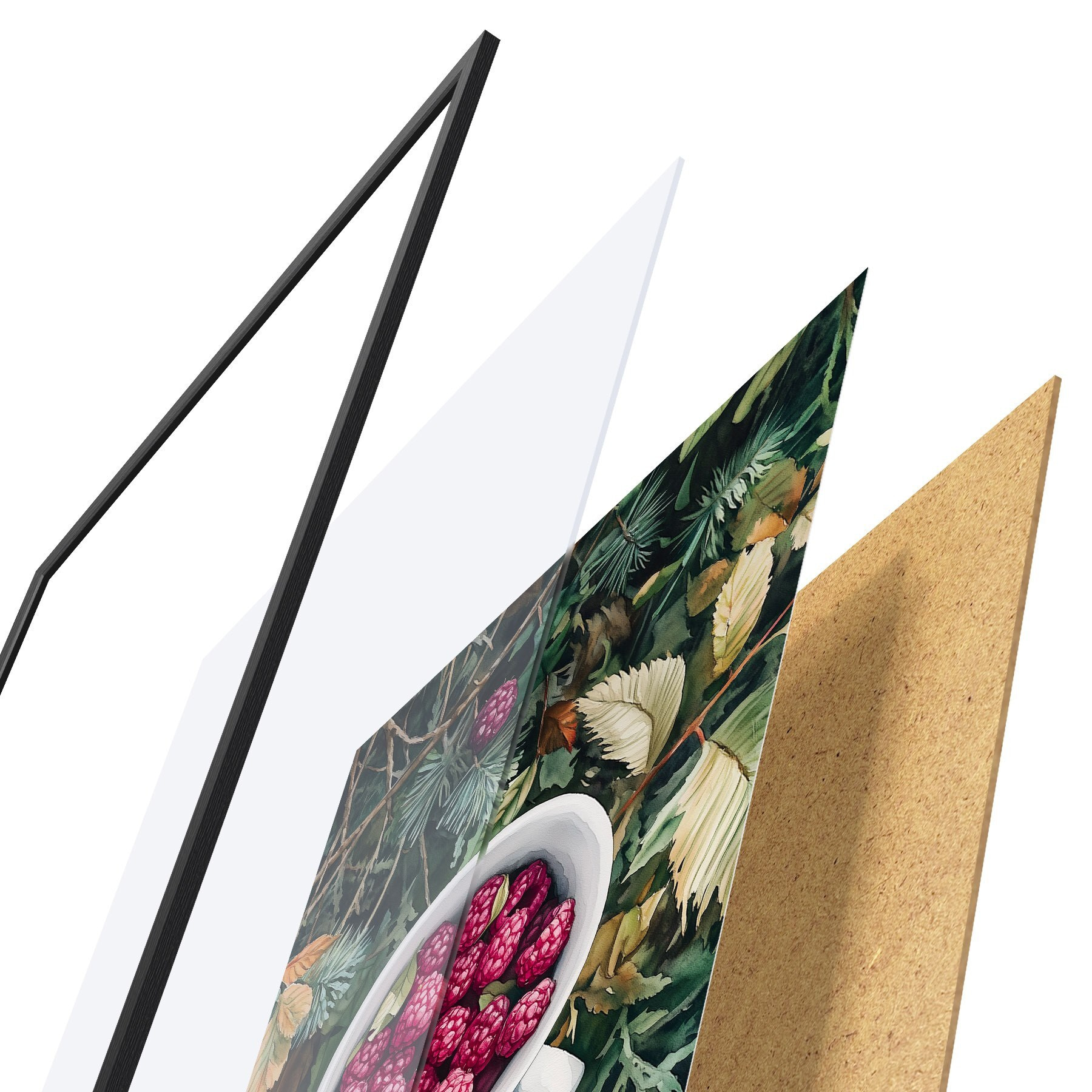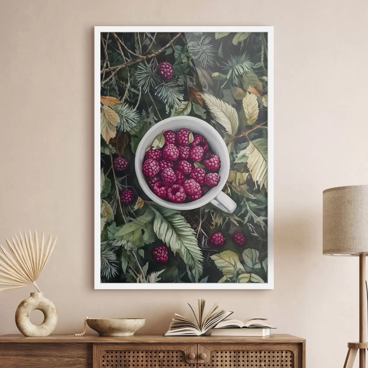Poster Sappige frambozen in het bos, rustiek, bladeren, aquarel stijl Nr f44023