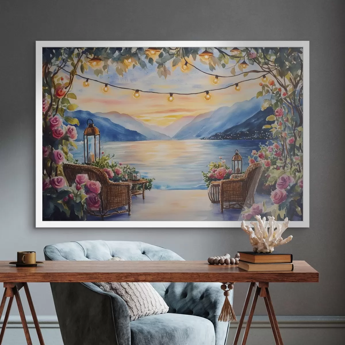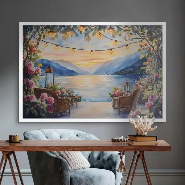 Poster Prachtige zonsondergang in de bergen, meer, rozen, boho stijl Nr f44025