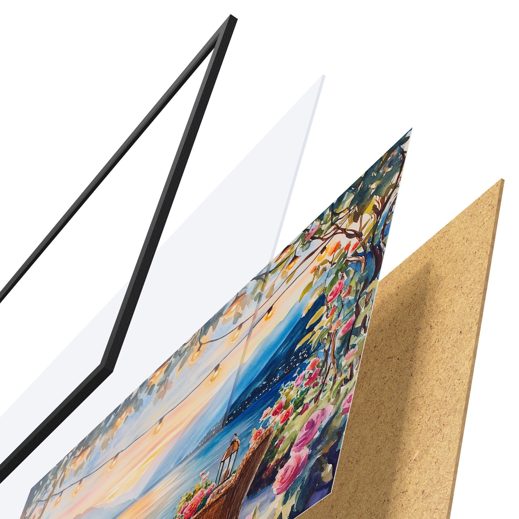 De poster bestaat uit een frame, plexiglas, geprinte afbeelding en spaanplaat achterkant. De poster kan meteen aan de muur worden gehangen dankzij de bevestigingen op de achterkant.