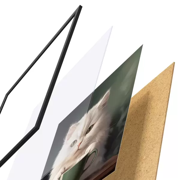 De poster bestaat uit een frame, plexiglas, geprinte afbeelding en spaanplaat achterkant. De poster kan meteen aan de muur worden gehangen dankzij de bevestigingen op de achterkant.