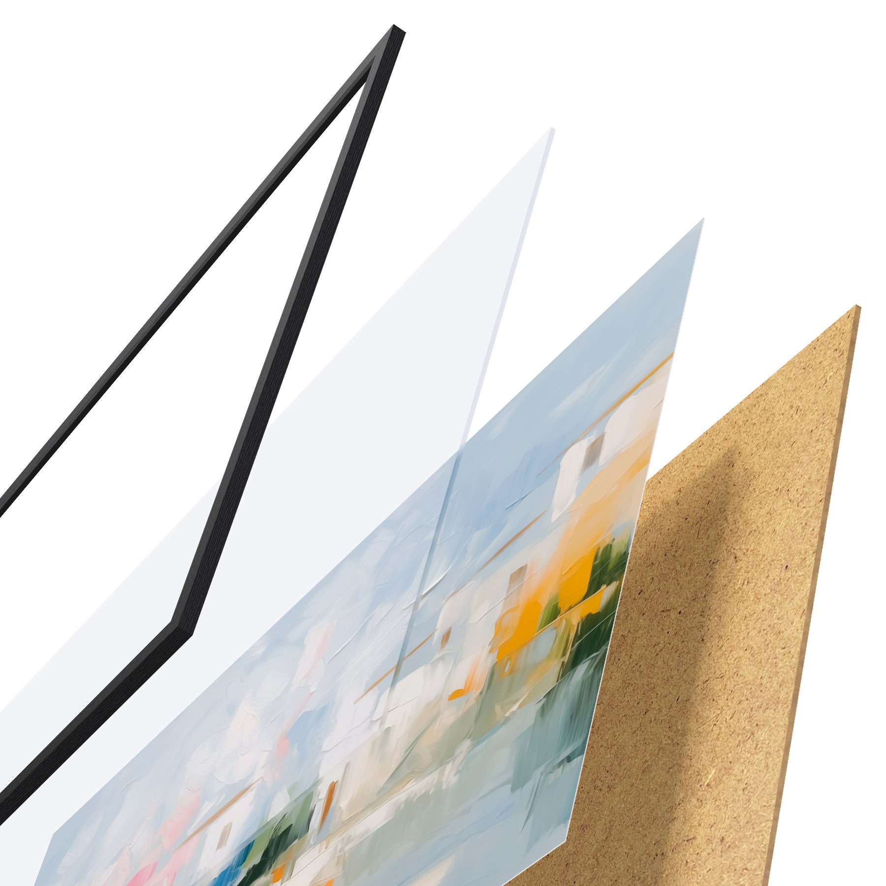De poster bestaat uit een frame, plexiglas, geprinte afbeelding en spaanplaat achterkant. De poster kan meteen aan de muur worden gehangen dankzij de bevestigingen op de achterkant.