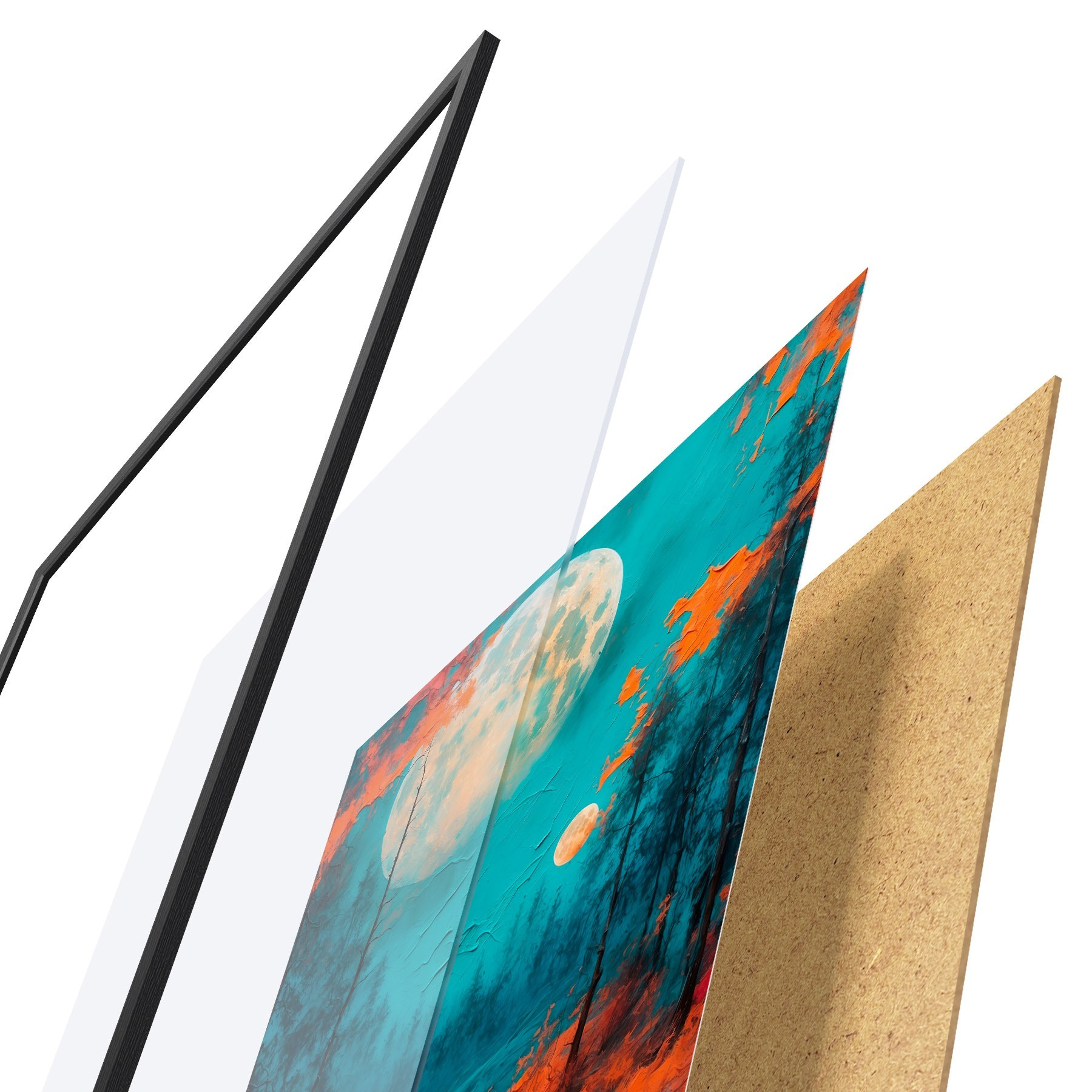 De poster bestaat uit een frame, plexiglas, geprinte afbeelding en spaanplaat achterkant. De poster kan meteen aan de muur worden gehangen dankzij de bevestigingen op de achterkant.