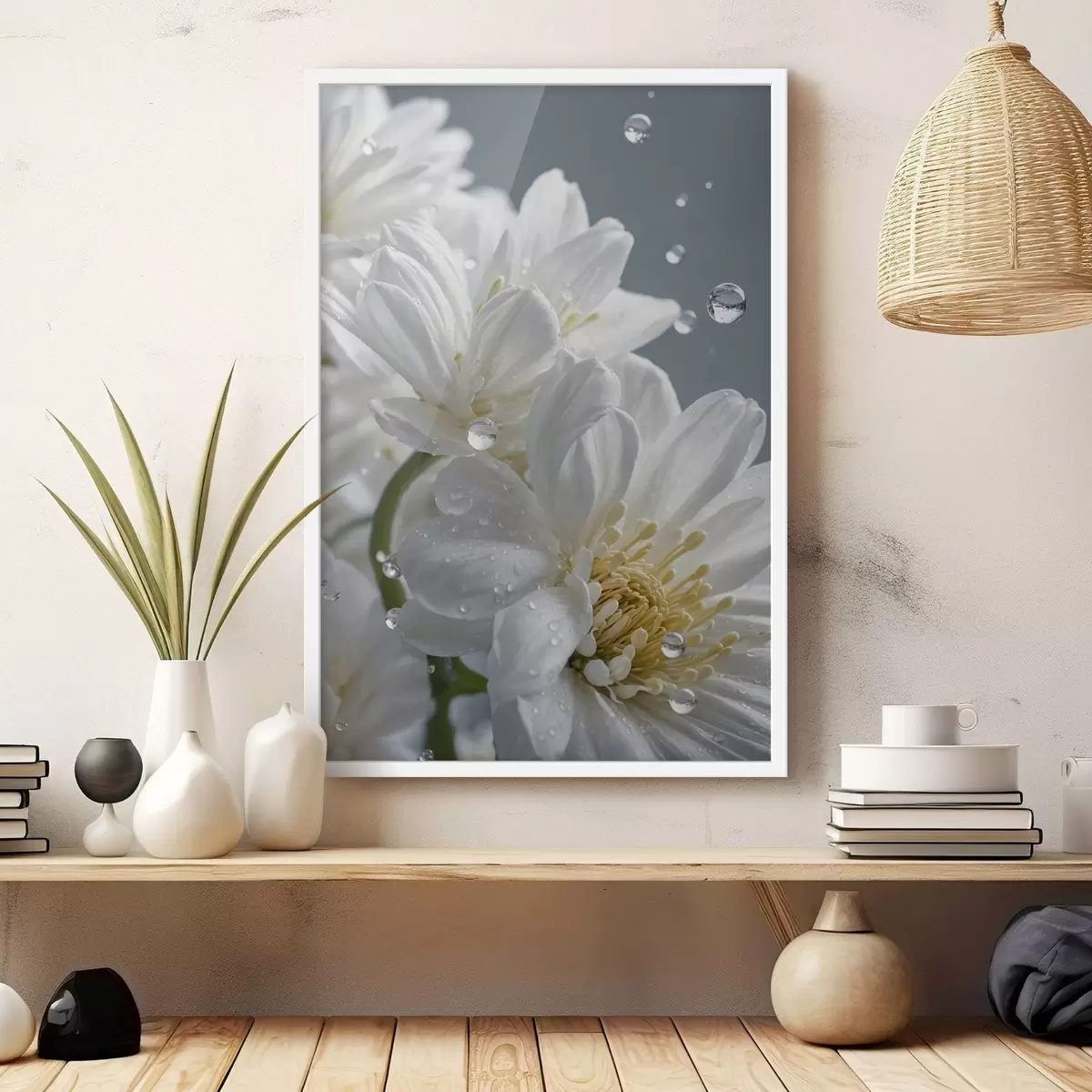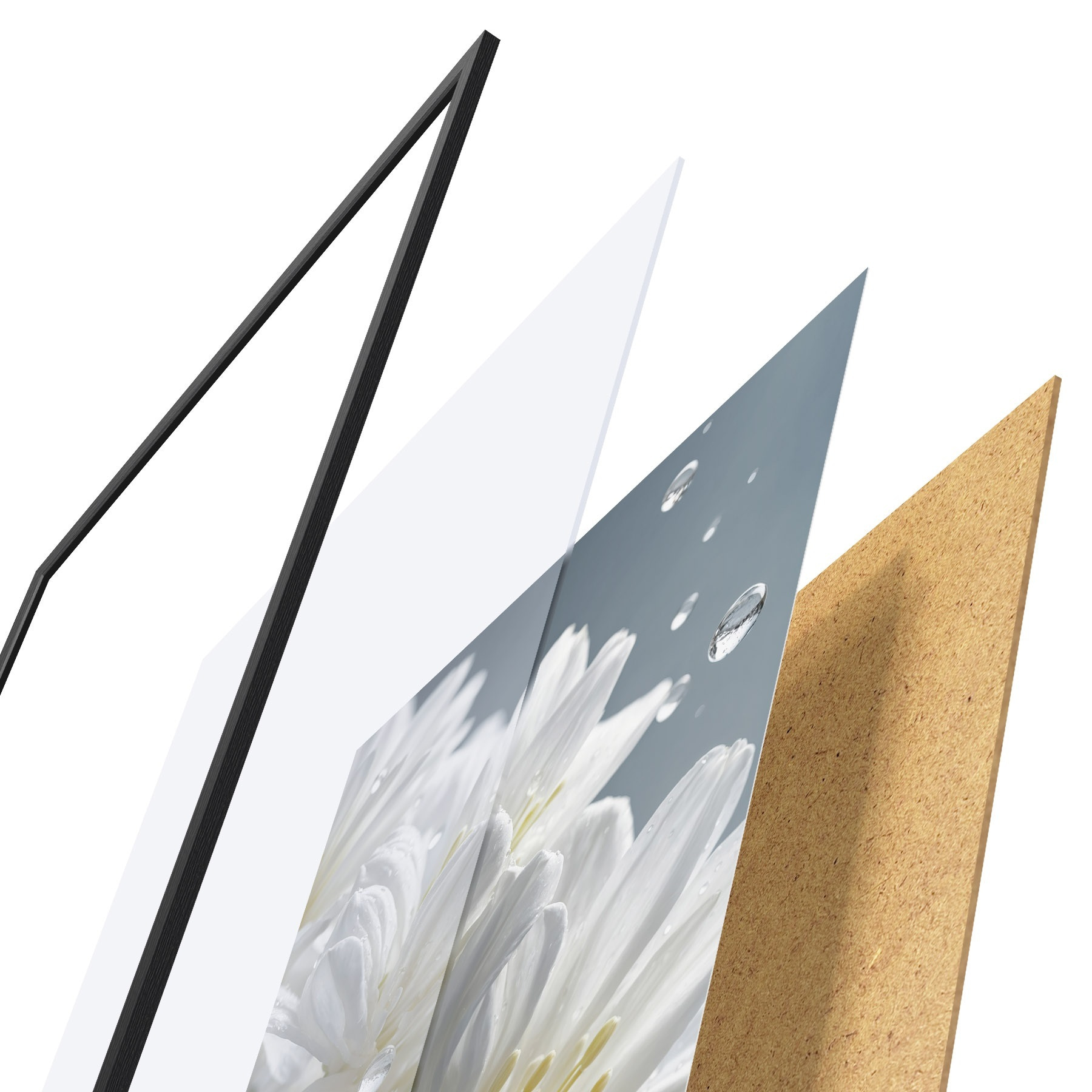 De poster bestaat uit een frame, plexiglas, geprinte afbeelding en spaanplaat achterkant. De poster kan meteen aan de muur worden gehangen dankzij de bevestigingen op de achterkant.