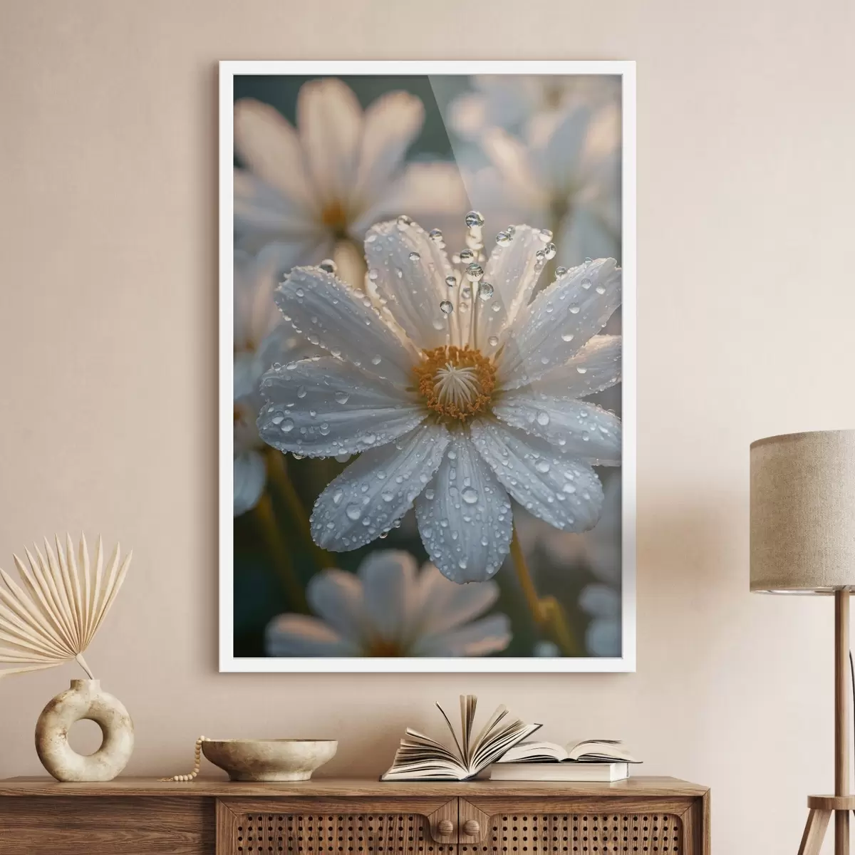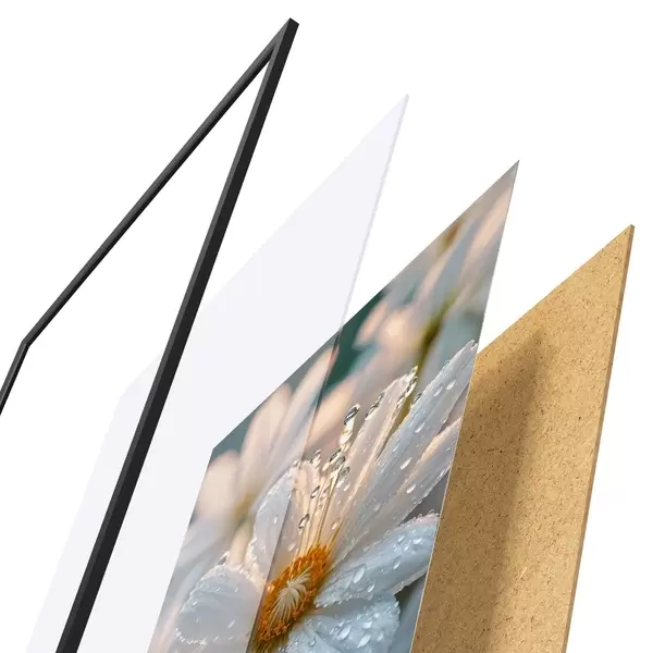 De poster bestaat uit een frame, plexiglas, geprinte afbeelding en spaanplaat achterkant. De poster kan meteen aan de muur worden gehangen dankzij de bevestigingen op de achterkant.