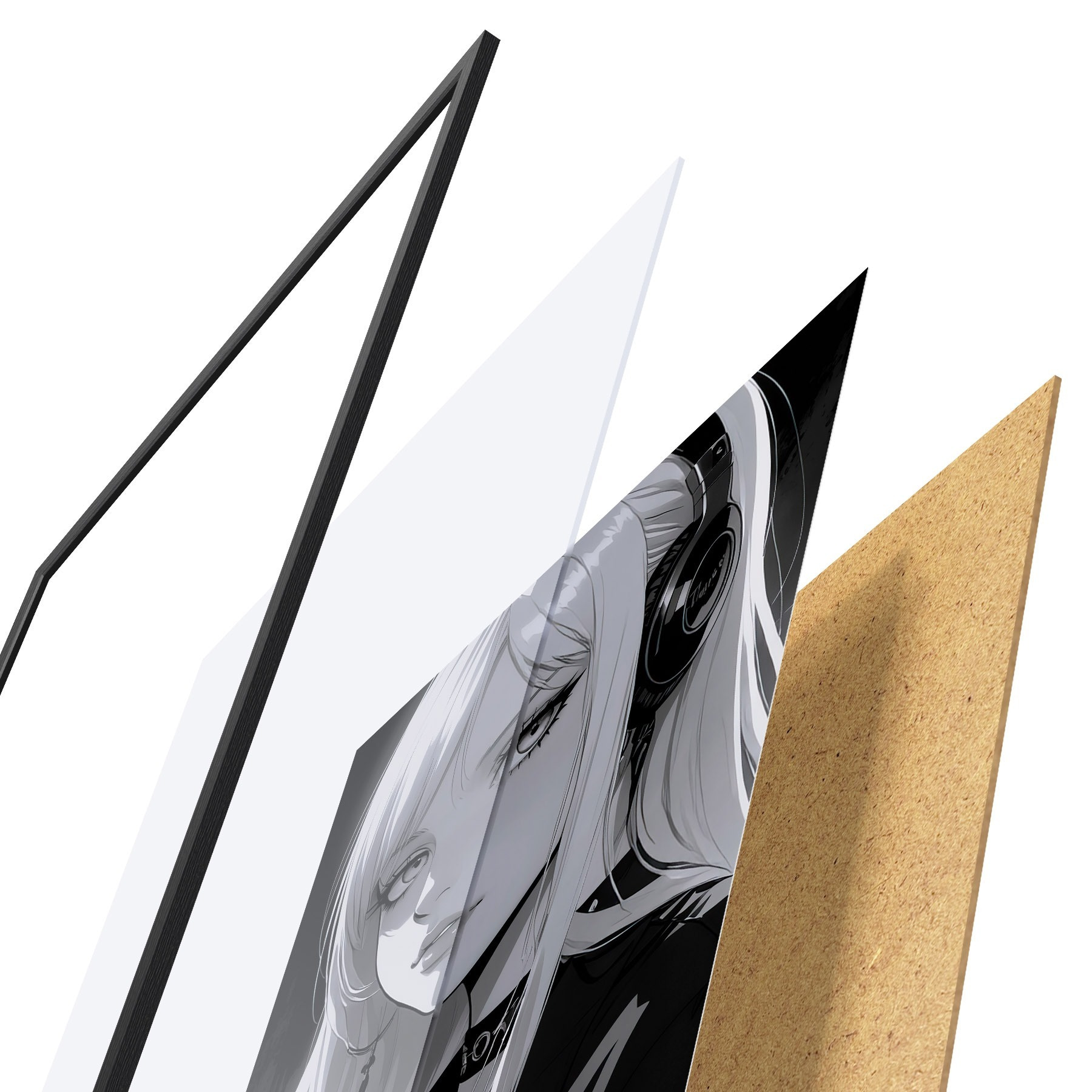 De poster bestaat uit een frame, plexiglas, geprinte afbeelding en spaanplaat achterkant. De poster kan meteen aan de muur worden gehangen dankzij de bevestigingen op de achterkant.