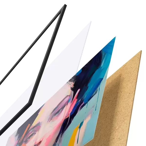 De poster bestaat uit een frame, plexiglas, geprinte afbeelding en spaanplaat achterkant. De poster kan meteen aan de muur worden gehangen dankzij de bevestigingen op de achterkant.