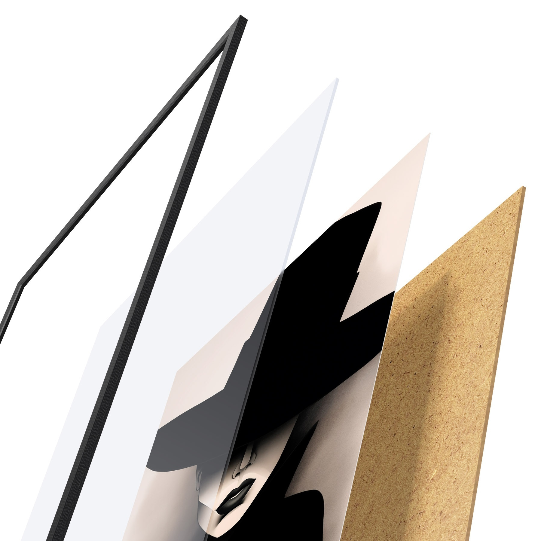 De poster bestaat uit een frame, plexiglas, geprinte afbeelding en spaanplaat achterkant. De poster kan meteen aan de muur worden gehangen dankzij de bevestigingen op de achterkant.