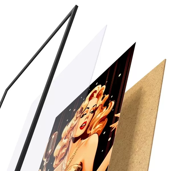 De poster bestaat uit een frame, plexiglas, geprinte afbeelding en spaanplaat achterkant. De poster kan meteen aan de muur worden gehangen dankzij de bevestigingen op de achterkant.