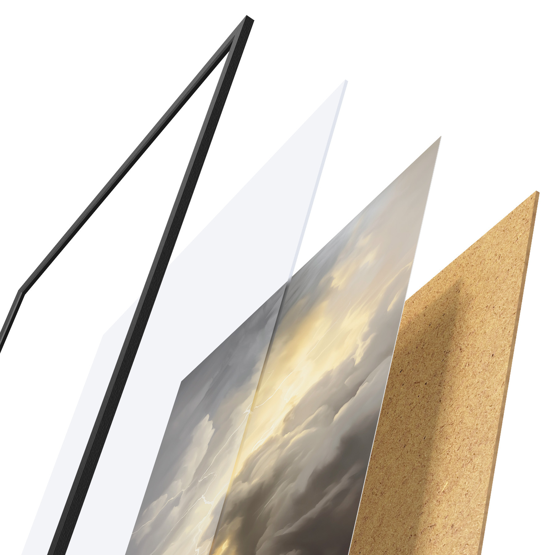 De poster bestaat uit een frame, plexiglas, geprinte afbeelding en spaanplaat achterkant. De poster kan meteen aan de muur worden gehangen dankzij de bevestigingen op de achterkant.