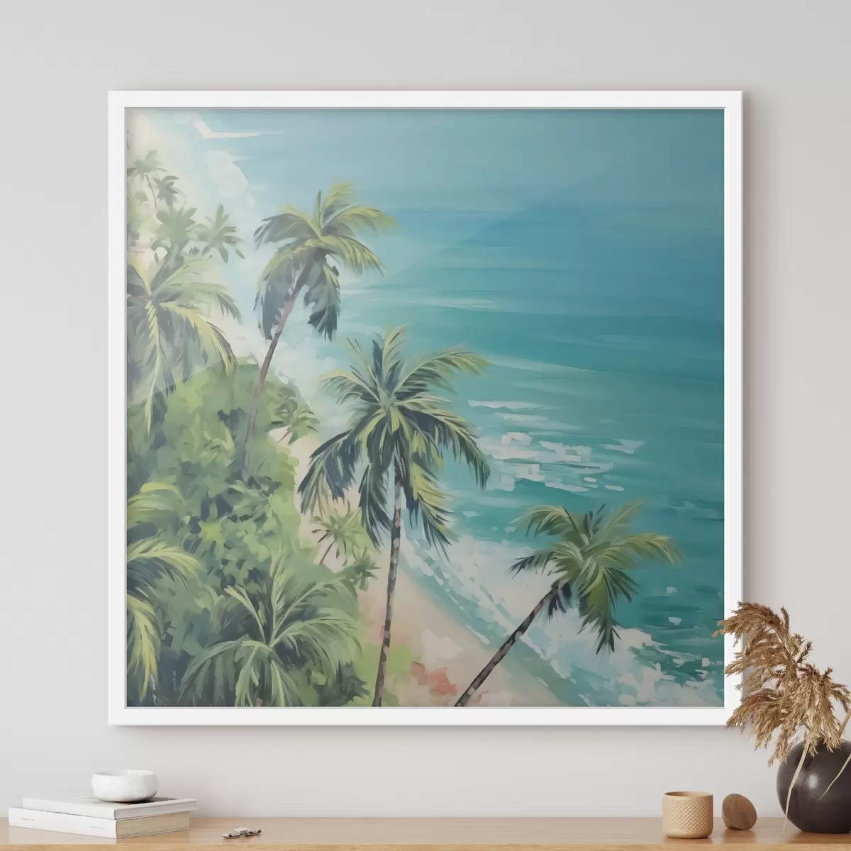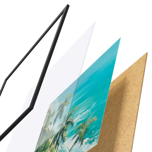 De poster bestaat uit een frame, plexiglas, geprinte afbeelding en spaanplaat achterkant. De poster kan meteen aan de muur worden gehangen dankzij de bevestigingen op de achterkant.