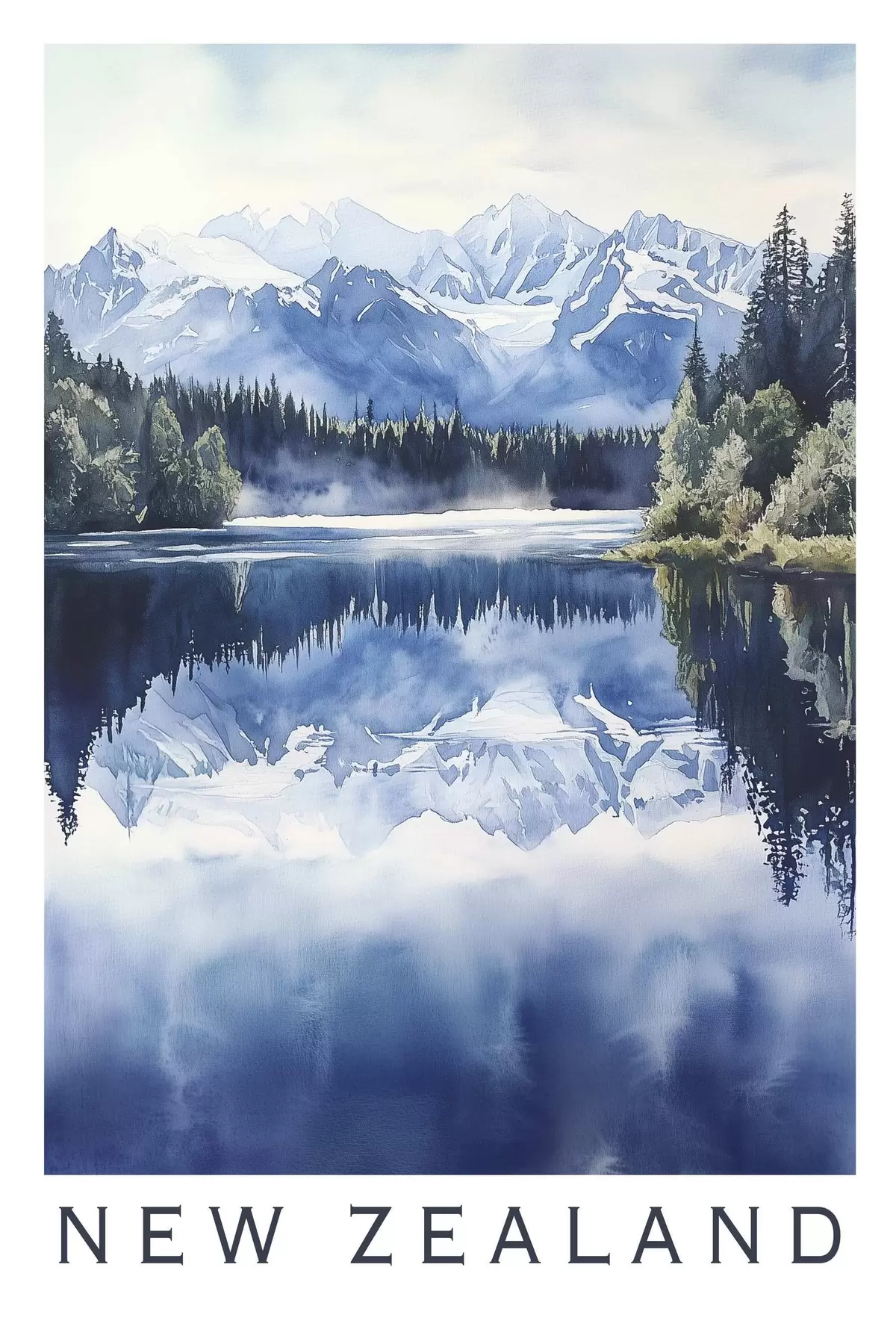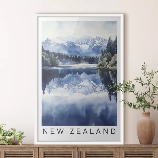 Poster Mooie bergen in Nieuw-Zeeland, aquarel stijl, meer, bos Nr f44144