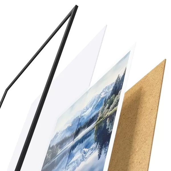 De poster bestaat uit een frame, plexiglas, geprinte afbeelding en spaanplaat achterkant. De poster kan meteen aan de muur worden gehangen dankzij de bevestigingen op de achterkant.