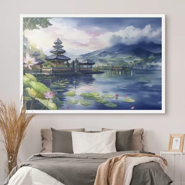 Poster Indonesisch eiland, tempel, boeddhisme, tropische natuur, aquarelstijl Nr f44148