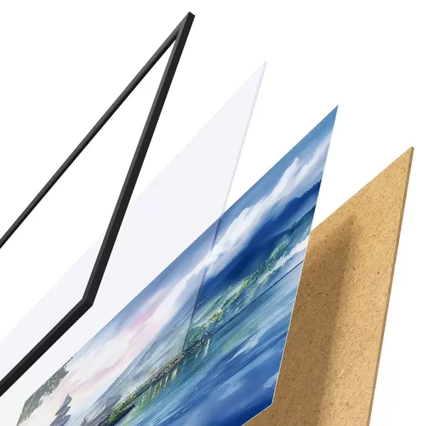 De poster bestaat uit een frame, plexiglas, geprinte afbeelding en spaanplaat achterkant. De poster kan meteen aan de muur worden gehangen dankzij de bevestigingen op de achterkant.