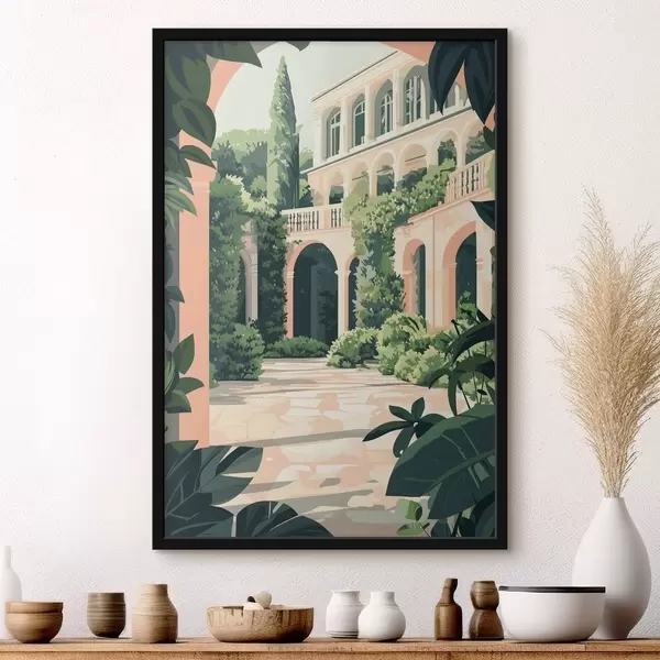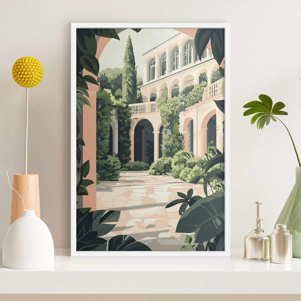 Poster Mediterrane architectuur, tropische natuur, vlakke stijl, villa met tuin Nr f44150