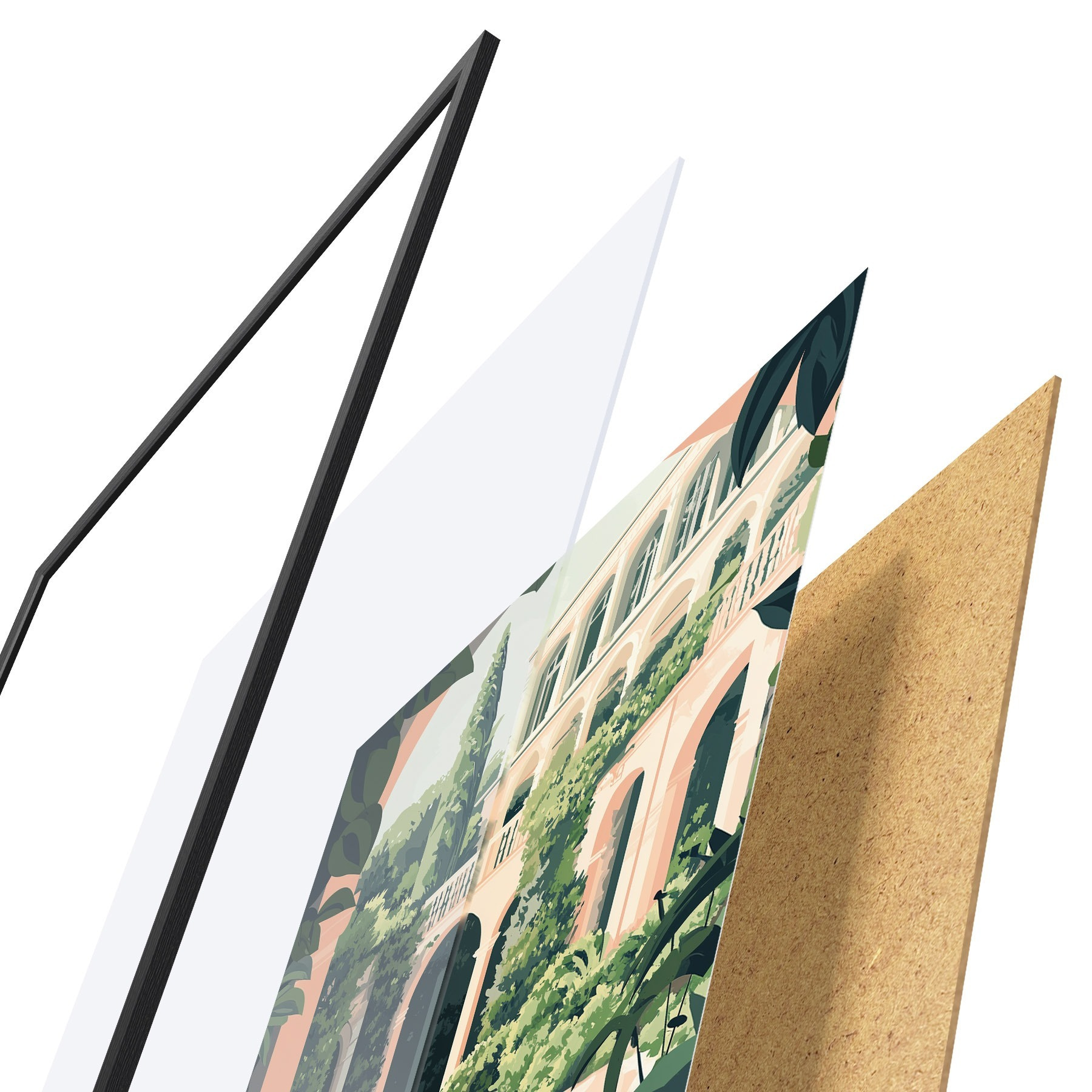 De poster bestaat uit een frame, plexiglas, geprinte afbeelding en spaanplaat achterkant. De poster kan meteen aan de muur worden gehangen dankzij de bevestigingen op de achterkant.