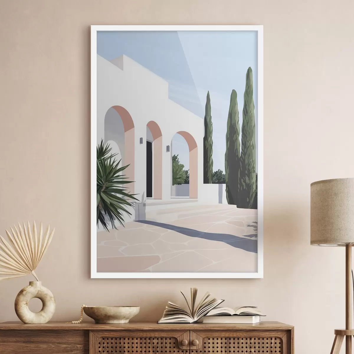 Poster Witte villa met bogen en tropische tuin, mediterrane, vlakke stijl f44153
