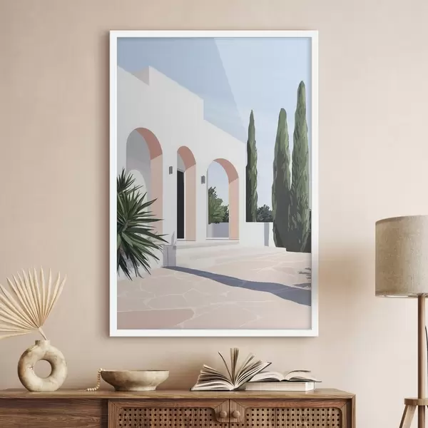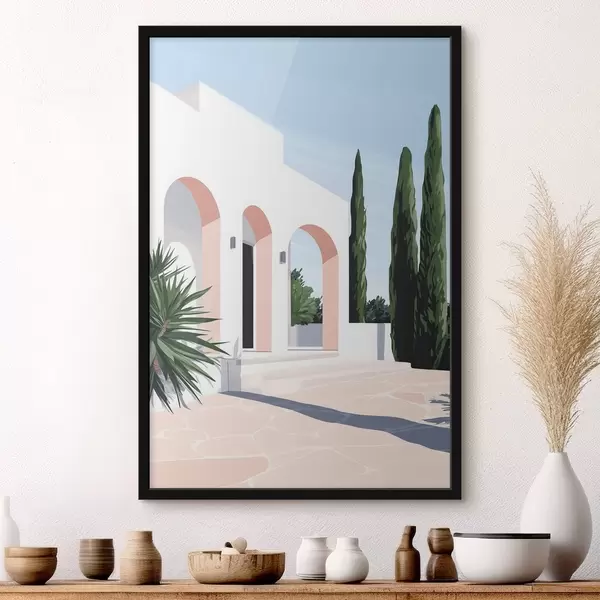 Poster Witte villa met bogen en tropische tuin, mediterrane, vlakke stijl Nr f44153
