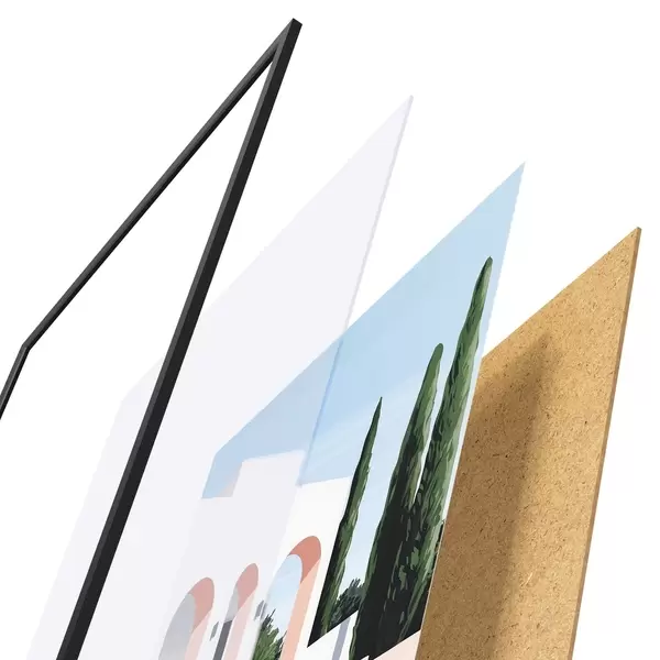 De poster bestaat uit een frame, plexiglas, geprinte afbeelding en spaanplaat achterkant. De poster kan meteen aan de muur worden gehangen dankzij de bevestigingen op de achterkant.