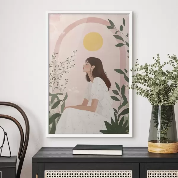 Poster Mooie vrouw in de tropische tuin, zon, pastelkleuren Nr f44155