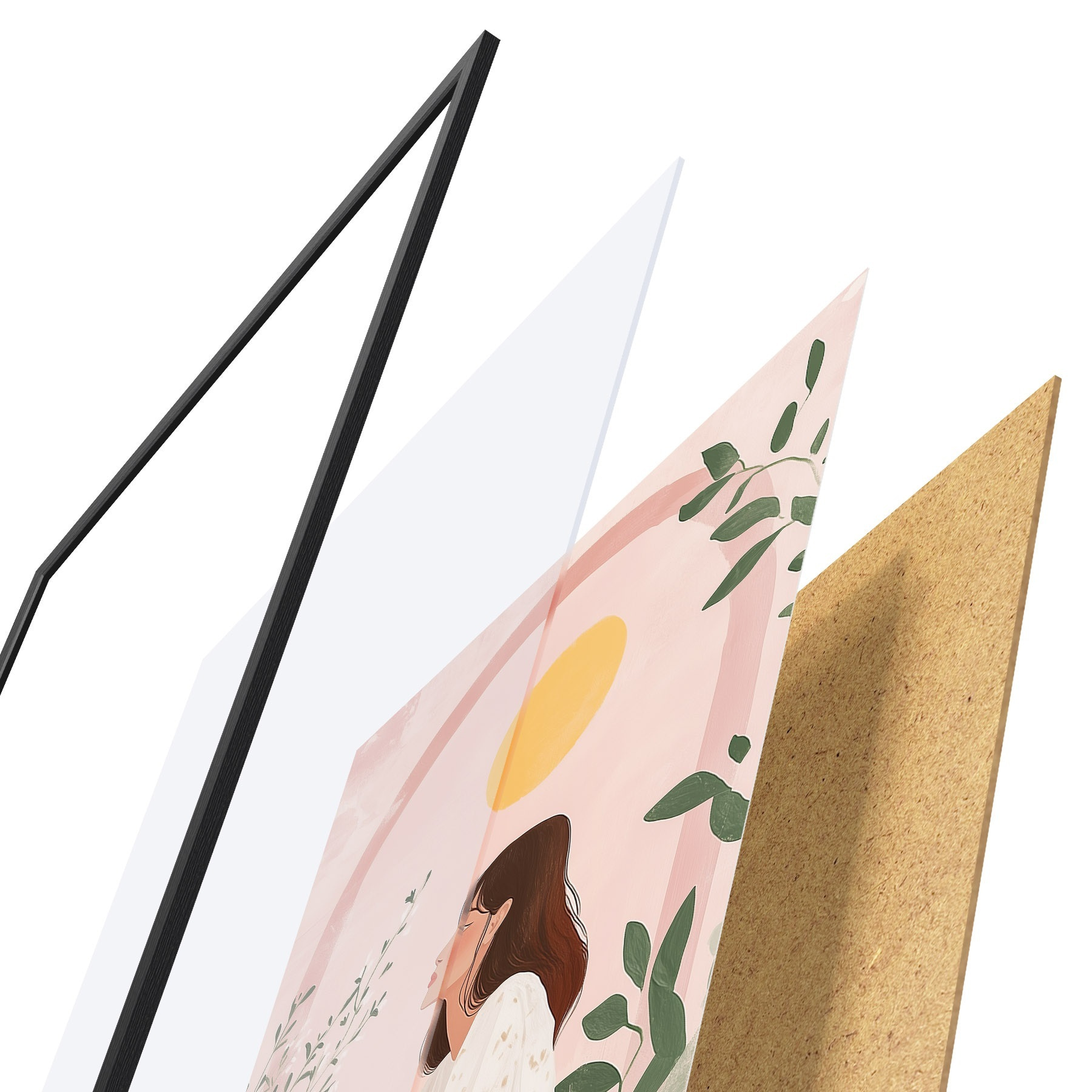 De poster bestaat uit een frame, plexiglas, geprinte afbeelding en spaanplaat achterkant. De poster kan meteen aan de muur worden gehangen dankzij de bevestigingen op de achterkant.
