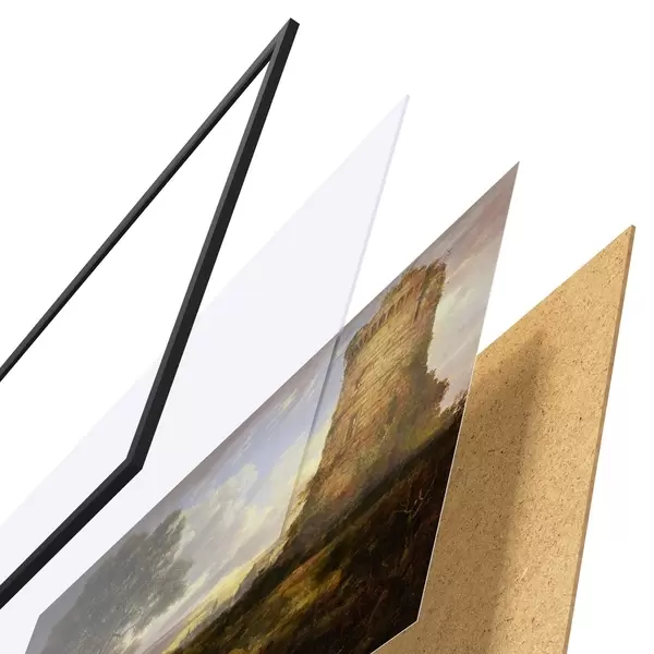 De poster bestaat uit een frame, plexiglas, geprinte afbeelding en spaanplaat achterkant. De poster kan meteen aan de muur worden gehangen dankzij de bevestigingen op de achterkant.