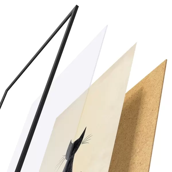 De poster bestaat uit een frame, plexiglas, geprinte afbeelding en spaanplaat achterkant. De poster kan meteen aan de muur worden gehangen dankzij de bevestigingen op de achterkant.