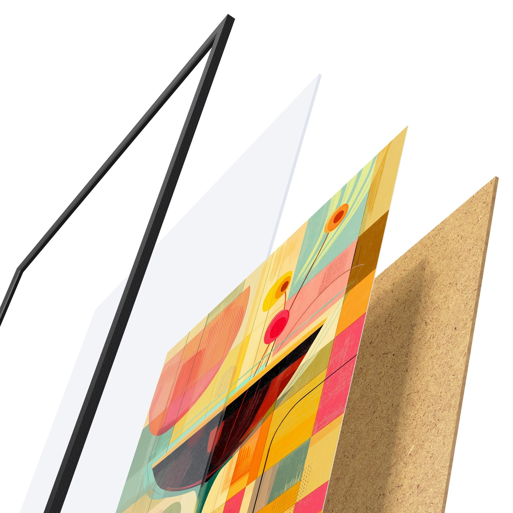 De poster bestaat uit een frame, plexiglas, geprinte afbeelding en spaanplaat achterkant. De poster kan meteen aan de muur worden gehangen dankzij de bevestigingen op de achterkant.