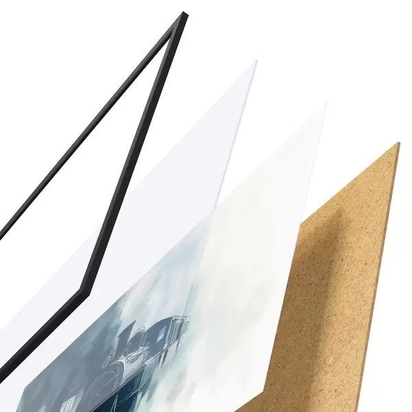 De poster bestaat uit een frame, plexiglas, geprinte afbeelding en spaanplaat achterkant. De poster kan meteen aan de muur worden gehangen dankzij de bevestigingen op de achterkant.