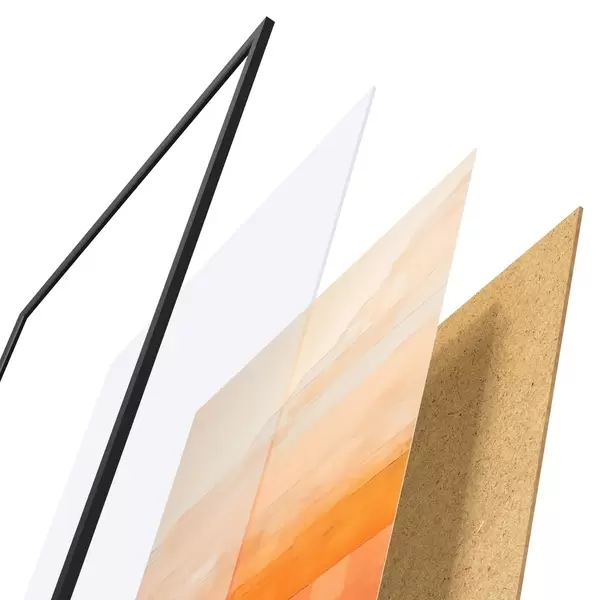 De poster bestaat uit een frame, plexiglas, geprinte afbeelding en spaanplaat achterkant. De poster kan meteen aan de muur worden gehangen dankzij de bevestigingen op de achterkant.