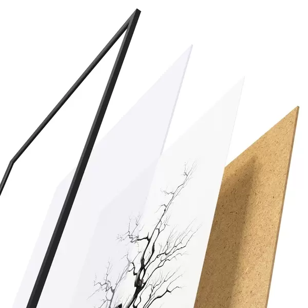 De poster bestaat uit een frame, plexiglas, geprinte afbeelding en spaanplaat achterkant. De poster kan meteen aan de muur worden gehangen dankzij de bevestigingen op de achterkant.