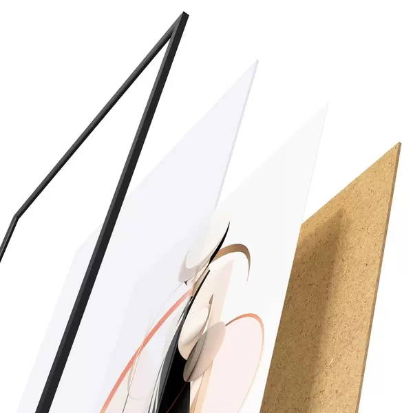 De poster bestaat uit een frame, plexiglas, geprinte afbeelding en spaanplaat achterkant. De poster kan meteen aan de muur worden gehangen dankzij de bevestigingen op de achterkant.