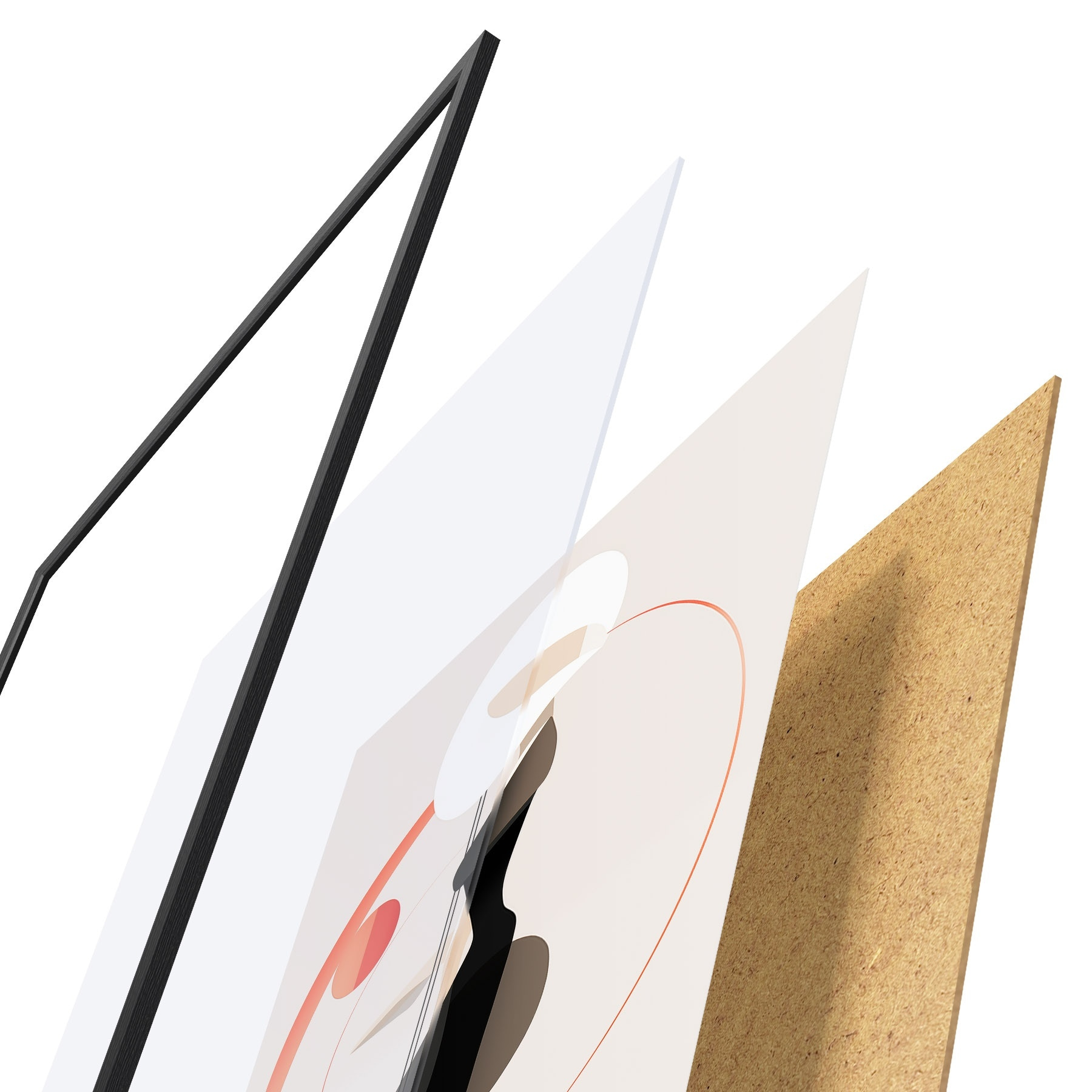 De poster bestaat uit een frame, plexiglas, geprinte afbeelding en spaanplaat achterkant. De poster kan meteen aan de muur worden gehangen dankzij de bevestigingen op de achterkant.