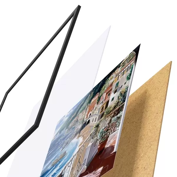 De poster bestaat uit een frame, plexiglas, geprinte afbeelding en spaanplaat achterkant. De poster kan meteen aan de muur worden gehangen dankzij de bevestigingen op de achterkant.