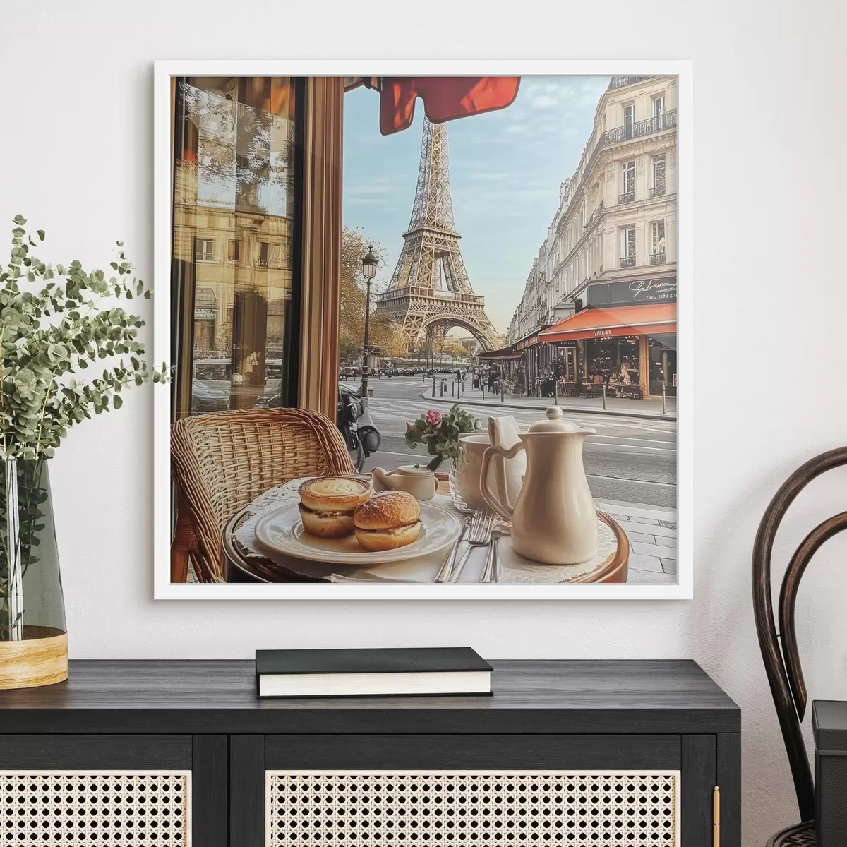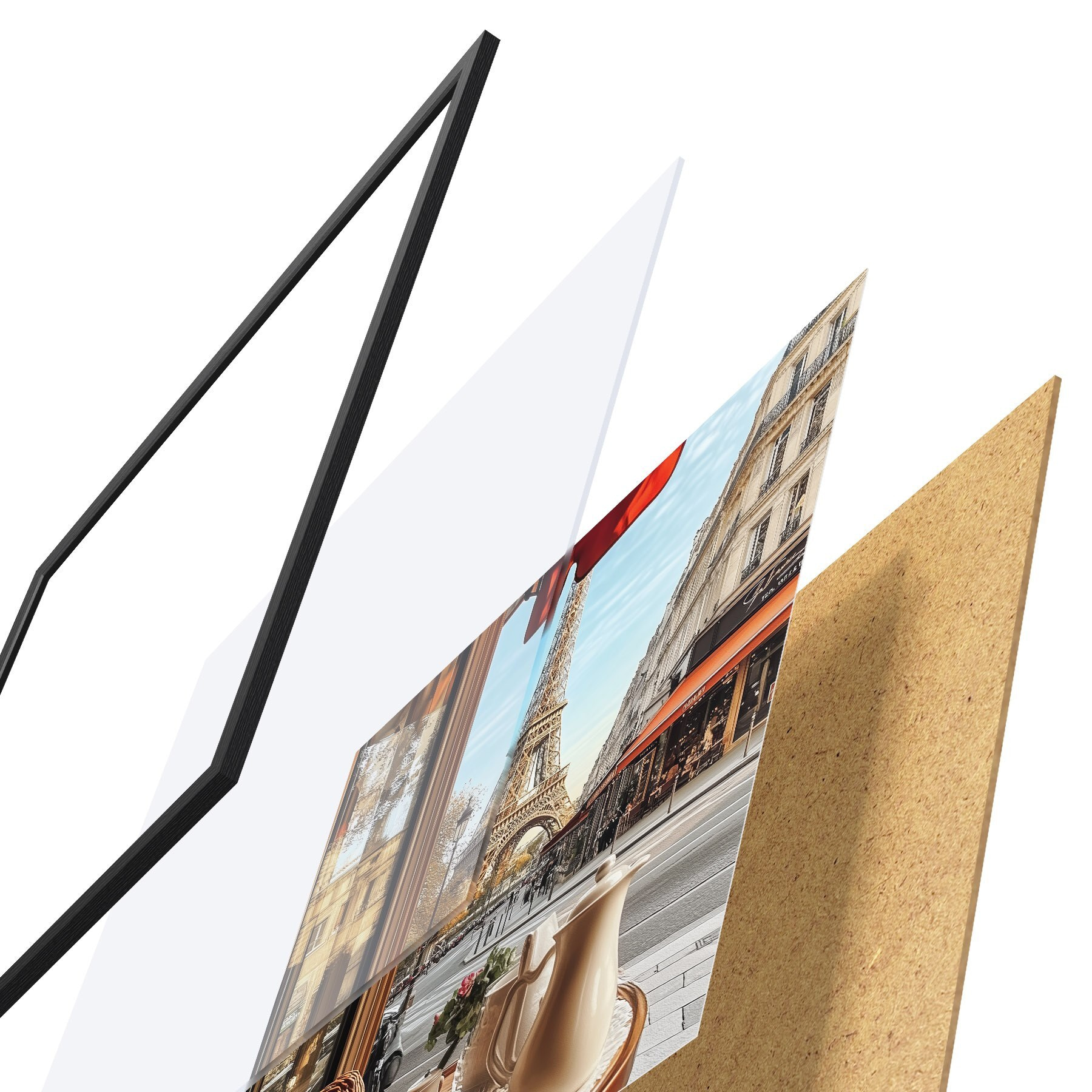 De poster bestaat uit een frame, plexiglas, geprinte afbeelding en spaanplaat achterkant. De poster kan meteen aan de muur worden gehangen dankzij de bevestigingen op de achterkant.