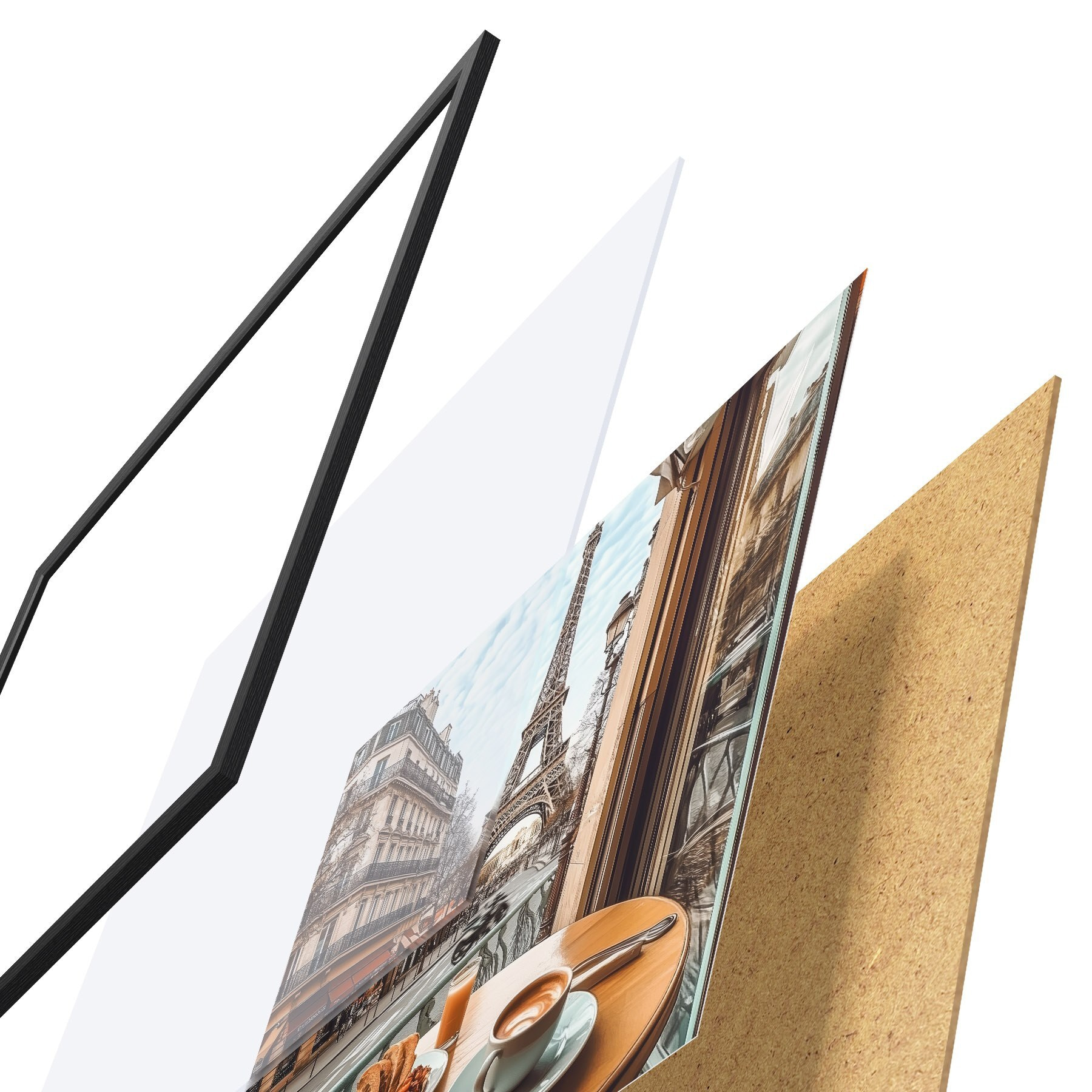 De poster bestaat uit een frame, plexiglas, geprinte afbeelding en spaanplaat achterkant. De poster kan meteen aan de muur worden gehangen dankzij de bevestigingen op de achterkant.