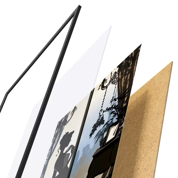 De poster bestaat uit een frame, plexiglas, geprinte afbeelding en spaanplaat achterkant. De poster kan meteen aan de muur worden gehangen dankzij de bevestigingen op de achterkant.