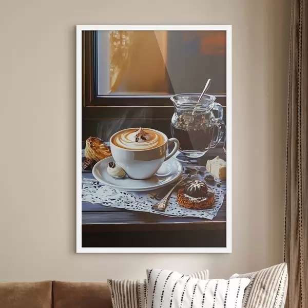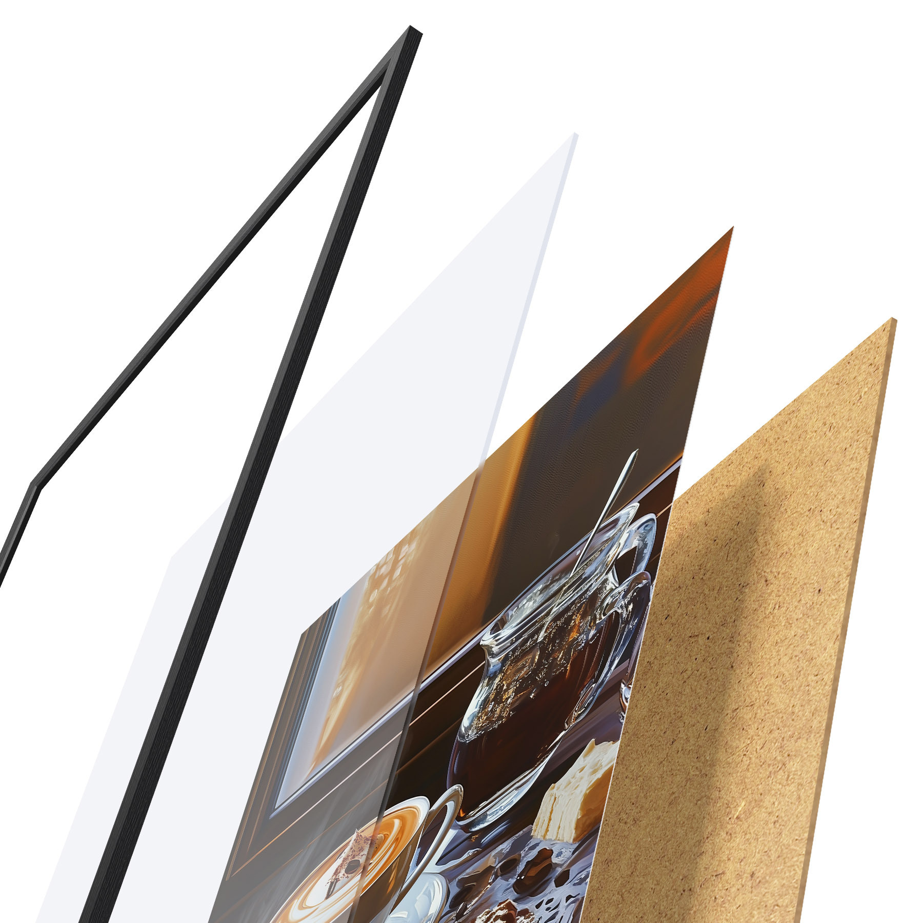 De poster bestaat uit een frame, plexiglas, geprinte afbeelding en spaanplaat achterkant. De poster kan meteen aan de muur worden gehangen dankzij de bevestigingen op de achterkant.