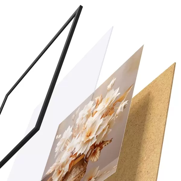 De poster bestaat uit een frame, plexiglas, geprinte afbeelding en spaanplaat achterkant. De poster kan meteen aan de muur worden gehangen dankzij de bevestigingen op de achterkant.