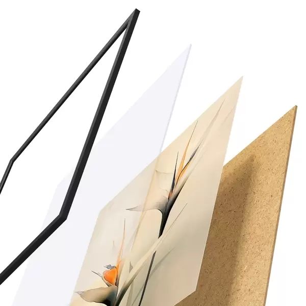 De poster bestaat uit een frame, plexiglas, geprinte afbeelding en spaanplaat achterkant. De poster kan meteen aan de muur worden gehangen dankzij de bevestigingen op de achterkant.