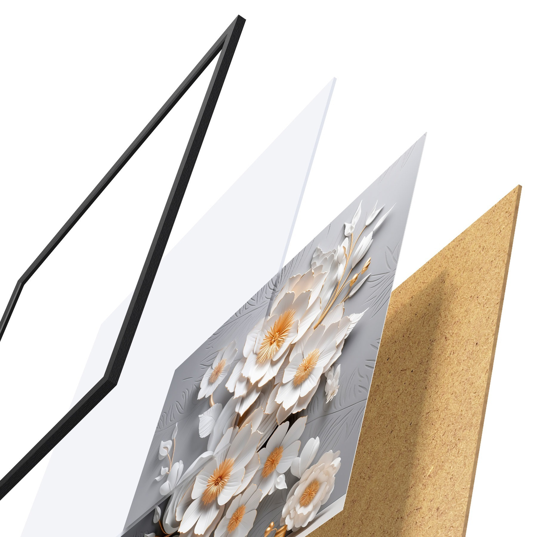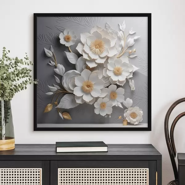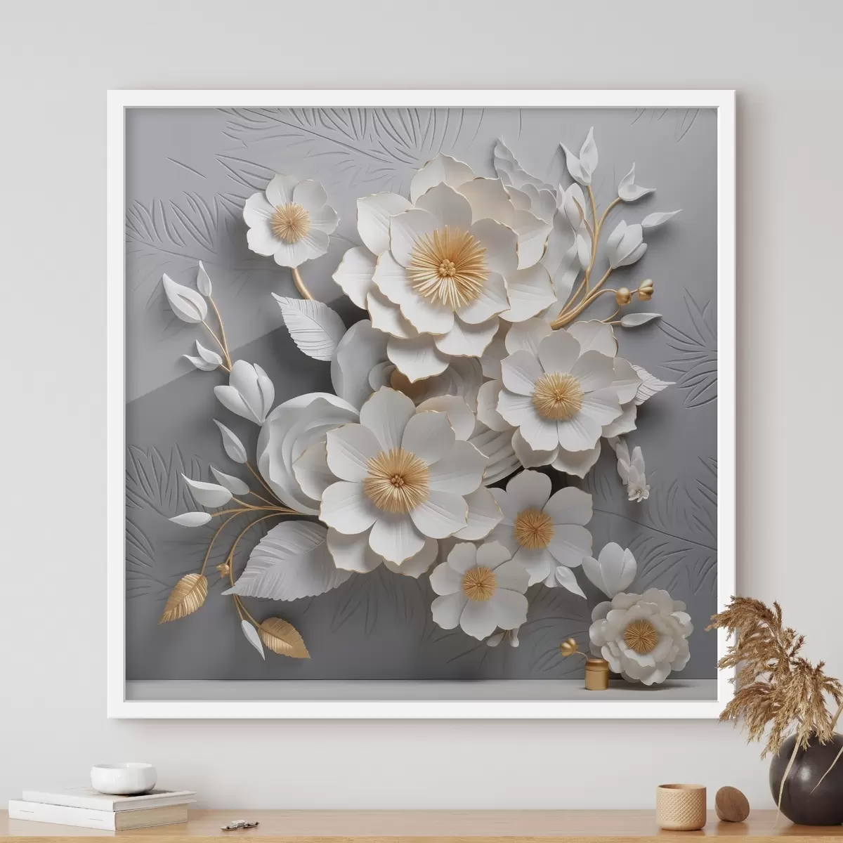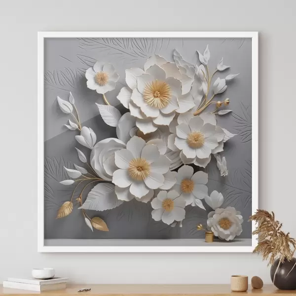 Poster Volumineuze witte bloemen op een grijze achtergrond in 3D-stijl Nr f44253