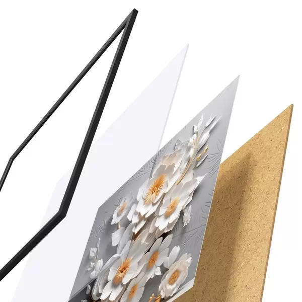 De poster bestaat uit een frame, plexiglas, geprinte afbeelding en spaanplaat achterkant. De poster kan meteen aan de muur worden gehangen dankzij de bevestigingen op de achterkant.