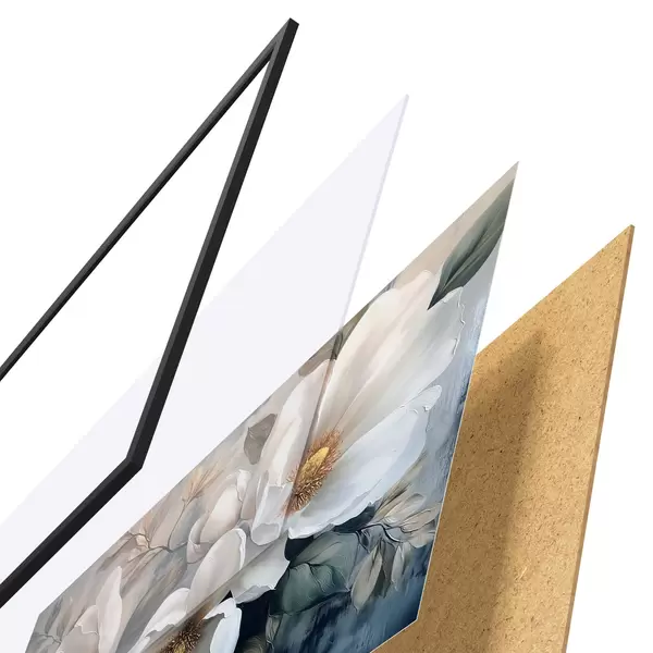 De poster bestaat uit een frame, plexiglas, geprinte afbeelding en spaanplaat achterkant. De poster kan meteen aan de muur worden gehangen dankzij de bevestigingen op de achterkant.