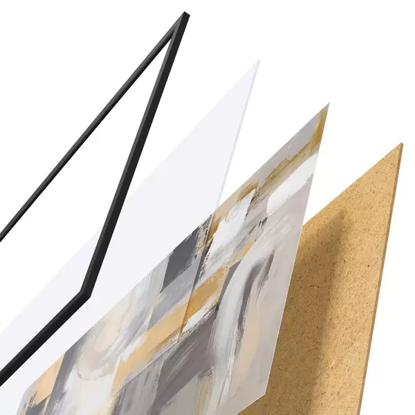 De poster bestaat uit een frame, plexiglas, geprinte afbeelding en spaanplaat achterkant. De poster kan meteen aan de muur worden gehangen dankzij de bevestigingen op de achterkant.
