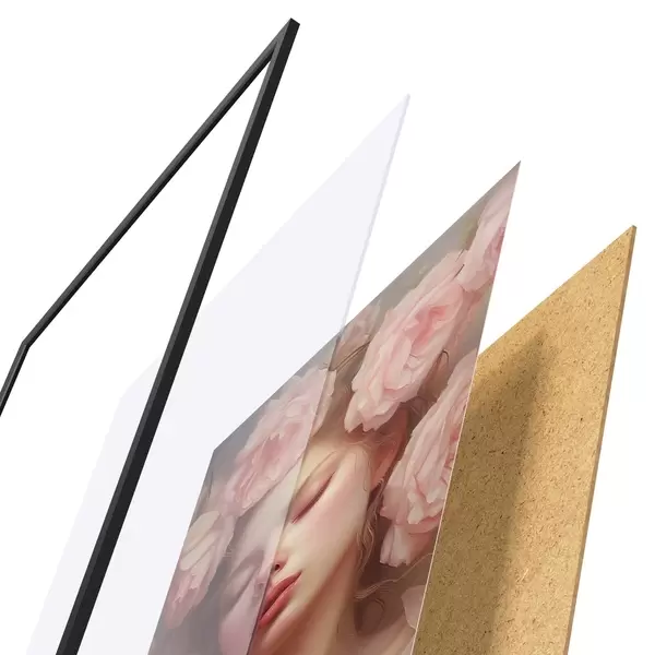 De poster bestaat uit een frame, plexiglas, geprinte afbeelding en spaanplaat achterkant. De poster kan meteen aan de muur worden gehangen dankzij de bevestigingen op de achterkant.