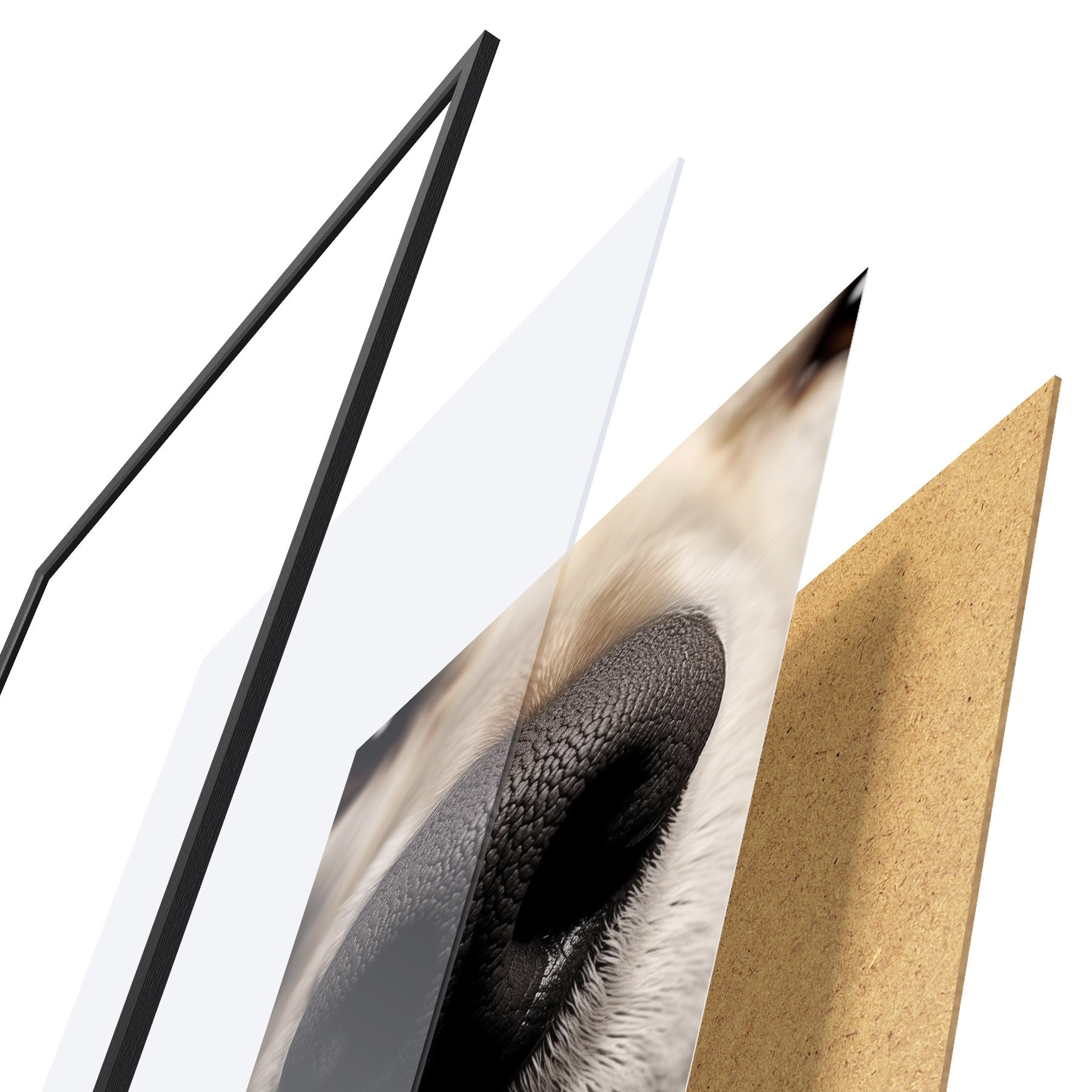 De poster bestaat uit een frame, plexiglas, geprinte afbeelding en spaanplaat achterkant. De poster kan meteen aan de muur worden gehangen dankzij de bevestigingen op de achterkant.