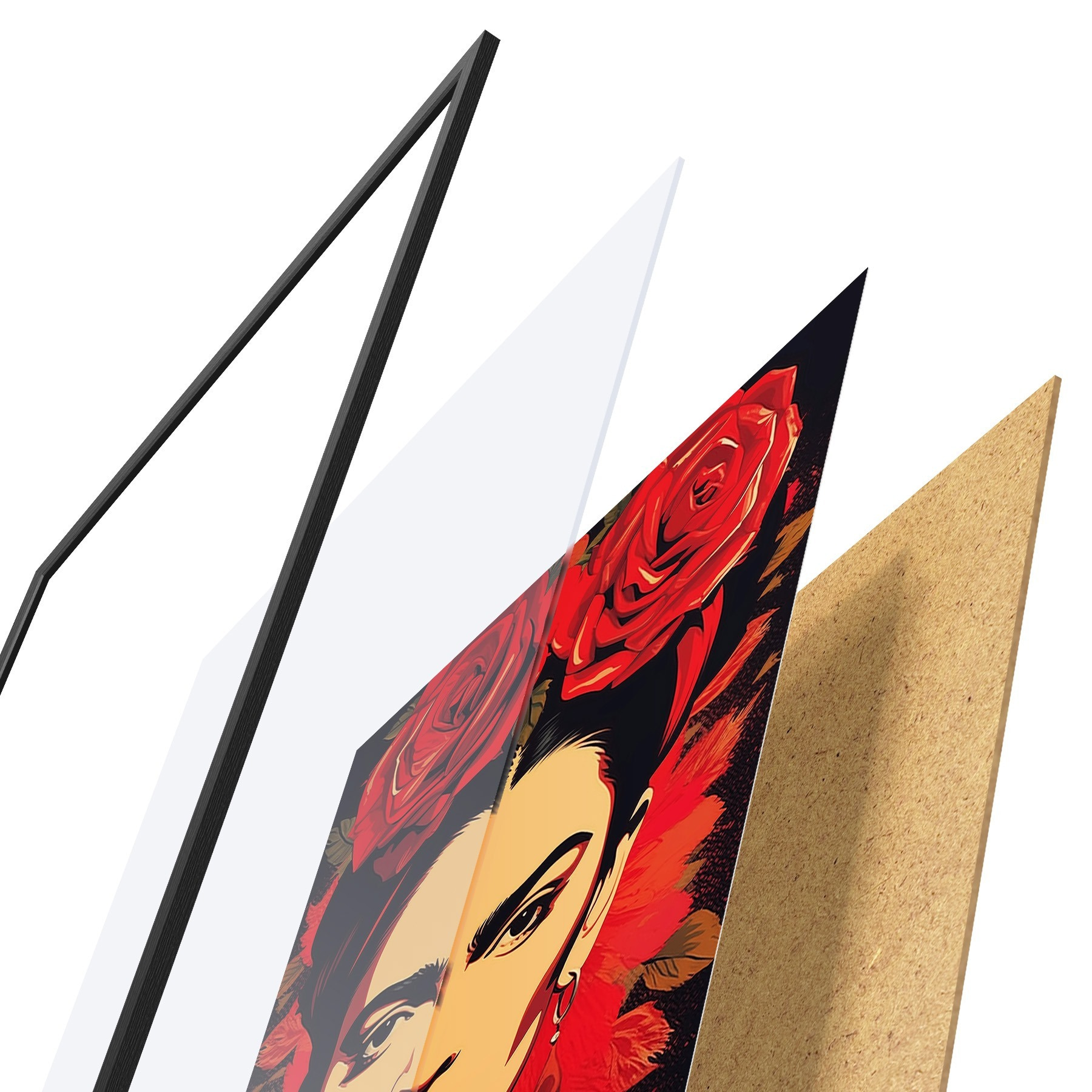 De poster bestaat uit een frame, plexiglas, geprinte afbeelding en spaanplaat achterkant. De poster kan meteen aan de muur worden gehangen dankzij de bevestigingen op de achterkant.